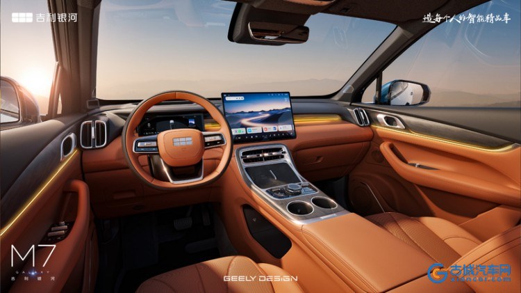 内饰方面,吉利银河M7采用了简约、科技感十足的设计风格。双色的内饰配色配合车内大面积的软性皮质包覆,以及木纹的中控台、水晶多媒体旋钮,豪华感拉满。此外,新车还配备了大尺寸悬浮式中控屏幕、50W无线快充等。
