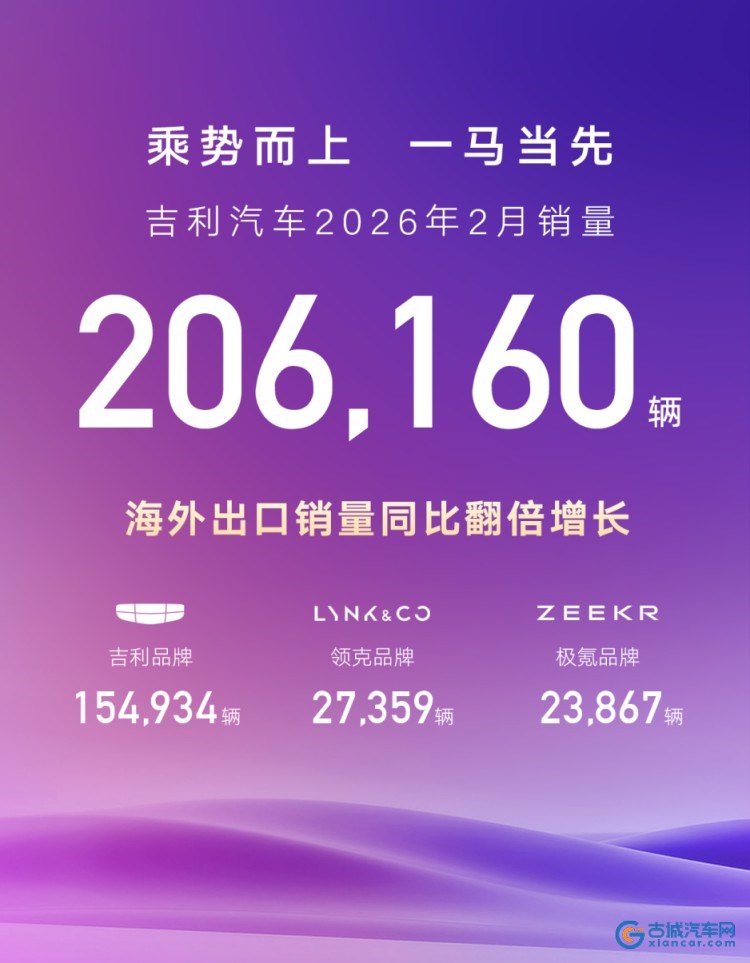 古城汽车网讯 3月1日,吉利汽车控股有限公司(0175.HK)公布最新销量数据:2月乘用车销量206160辆,开年连续两月保持同比正增长。2026年1-2月累计销量达476327辆,延续稳健增长态势。