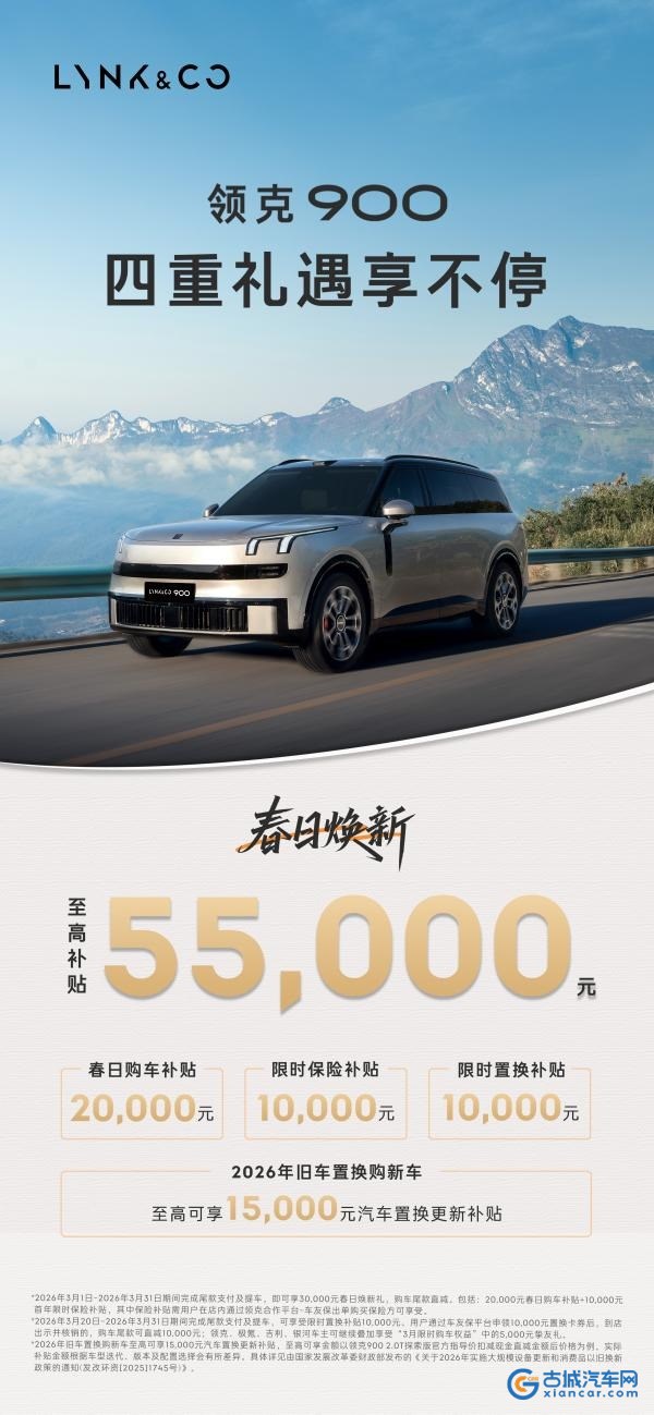 古城汽车网讯 近日,领克900推出春日焕新购车礼:至高5.5万元涵盖购车补贴、保险补贴及8大专属购车权益等多重礼遇,为用户提供入手旗舰座驾的绝佳窗口期。作为2026年央视春节联欢晚会“奇妙座驾”,领克900凭借“央视严选”的高品质和高价值背书,赢得用户信赖及关注,持续强化其在高端家庭SUV市场的地位。