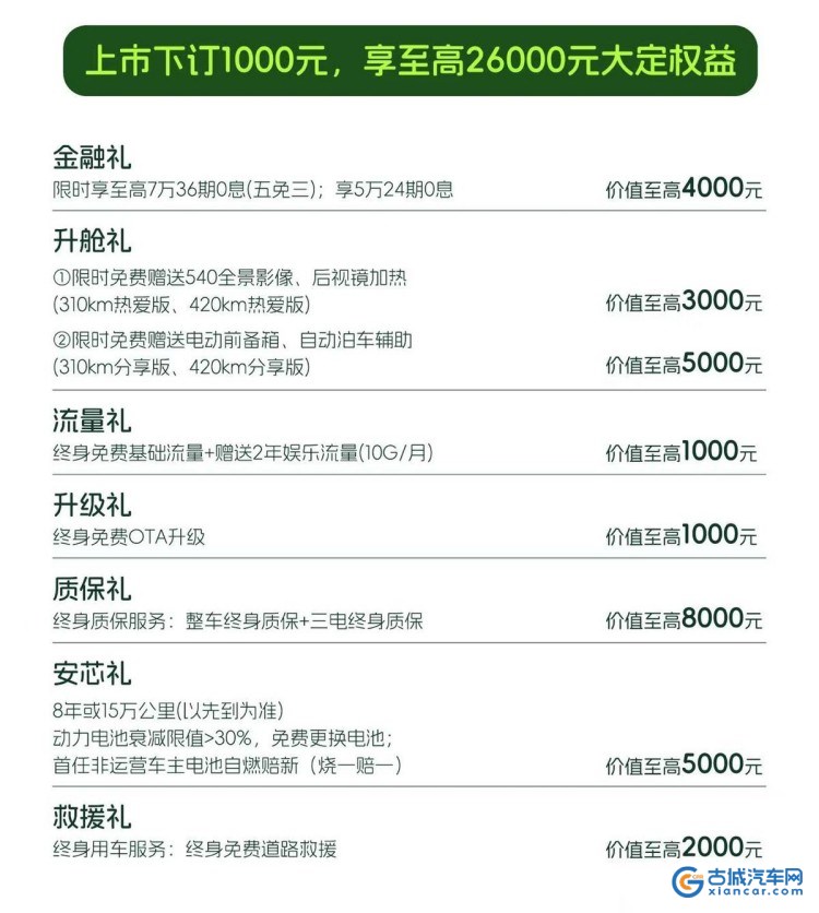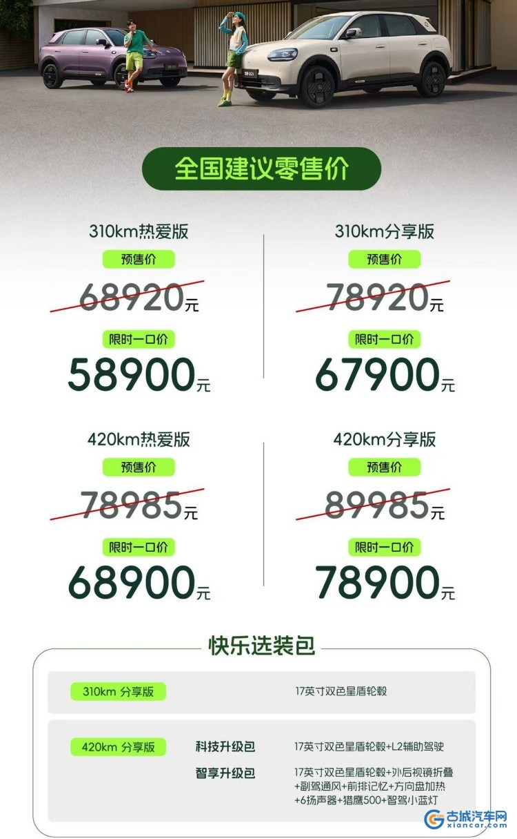 古城汽车网讯 3月30日,奇瑞QQ3 EV正式迎来上市,新车共推出4款车型,限时一口价5.89-7.89万元。与此同时,新车还推出了七重超值权益,上市下订1000元,享至高26000元大定权益。除此之外,还有快乐选装包可选。