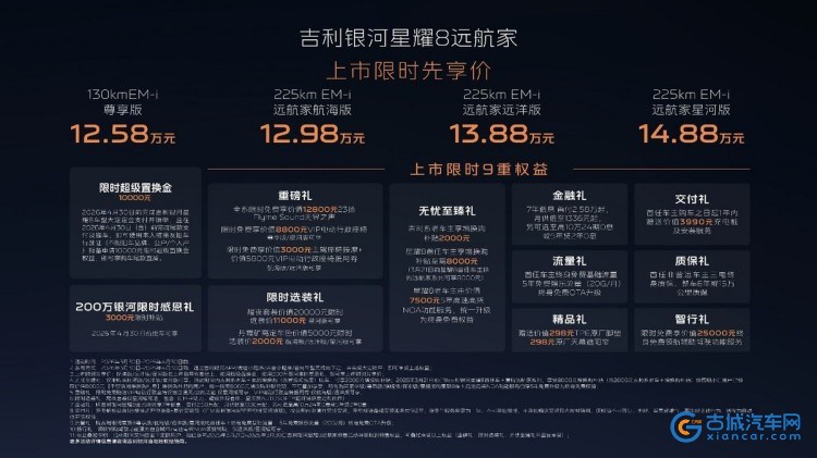 古城汽车网讯 3月30日,吉利银河星耀8远航家正式上市,新车共推出3款车型,售价区间为14.28-16.18万元,限时先享价12.98-14.88万元。与此同时,新车还推出了上市限时9重权益。