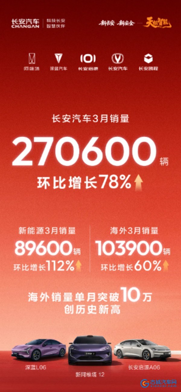 古城汽车网讯 4月1日,重庆长安汽车股份有限公司(以下简称“长安汽车”)公布了最新的销量成绩。数据显示,长安汽车3月销量达270600辆,环比增长78%;海外销量创历史新高,达103900辆,环比增长60%;新能源销量89600辆,环比增长112%。
