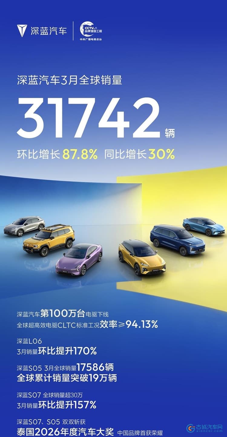 古城汽车网讯 近日,深蓝汽车发布2026年3月全球销量数据,单月销量达31742辆,同比增长30%,环比大幅增长87.8%,销量再创新高。