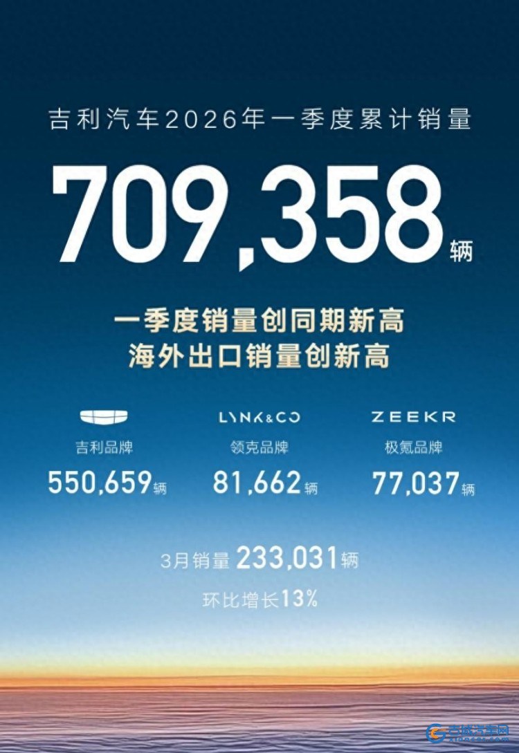 古城汽车网讯 4月1日,吉利汽车控股有限公司(0175.HK)公布最新销量数据:3月乘用车销量233031辆,环比增长13%。其中新能源销量(含吉利、领克、极氪)达127319辆,同比增长6%,环比增长8%,新能源销量占比55%。2026年一季度,吉利汽车累计销量达709358辆;新能源销量(含吉利、领克、极氪)达369059辆,同比增长9%,展现出强劲增长态势。