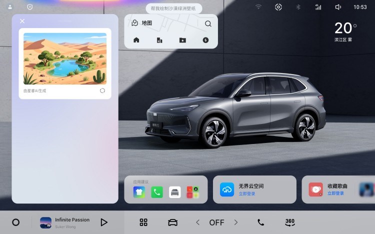 为进一步提升座舱的个性化与沉浸感,银河E5此次在视觉交互层面实现了跃升。系统新增10款Alive动态壁纸,涵盖萌宠、生长花、拆字等主题,支持点击互动与能量可视,不仅好看、好玩,更让车辆状态可视可感,为每一次出行增添情绪价值与实用便利。新增AI生成壁纸,用户只需唤醒语音助手说出自己的创意,车机便能实时生成高清图片并一键设为壁纸,真正实现“脑洞即画面”。同时,系统HMI图标与控件、色彩与形状也得到全面优化,整体视觉效果更加清爽通透,并以全量圆角构建起连贯的视觉流动感,审美体验更加舒适自然。