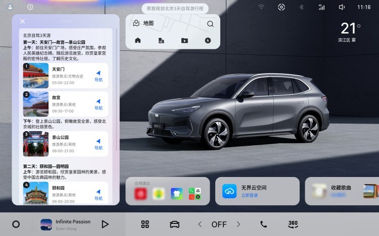 在座舱体验方面,银河E5充分回应用户对多元场景的需求。系统新增宠物模式,解决养宠人士临时离车的焦虑,用户一键开启后,空调自动切换外循环、车窗与天窗关闭,中控大屏常亮暖心提示,电量异常时手机APP还会及时提醒,为爱宠营造舒适安全的驻车环境。同时,网易云音乐新增Flyme Sound专区,支持臻品全景声、 HiRes无损等顶级音质;爱奇艺上线“云影院”专区,热门大片同步上车;蓝牙及USB音乐也支持智能匹配在线歌词,QQ音乐小窗更可实现逐字歌词高亮。从听觉到视觉,座舱影音体验实现全方位跃升,让每一次出行尽享愉悦。AI语音助手也再度升级,不仅优化了语音识别与语义理解能力,听得懂你的话外音,更接入星睿AI大模型,一句话即可完成行程规划并一键发起导航,让出行规划更加简单高效。